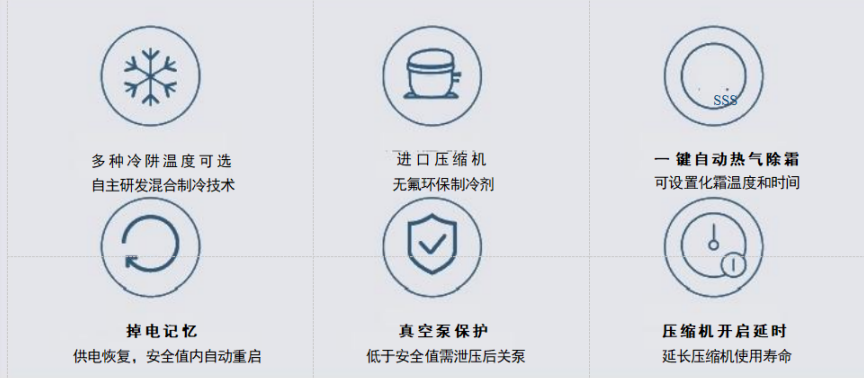 ◎ 一鍵自動熱氣除霜,配備除霜電磁閥,冷阱內置盤管直接加熱進行除霜,可設置化霜溫度和化霜時間;